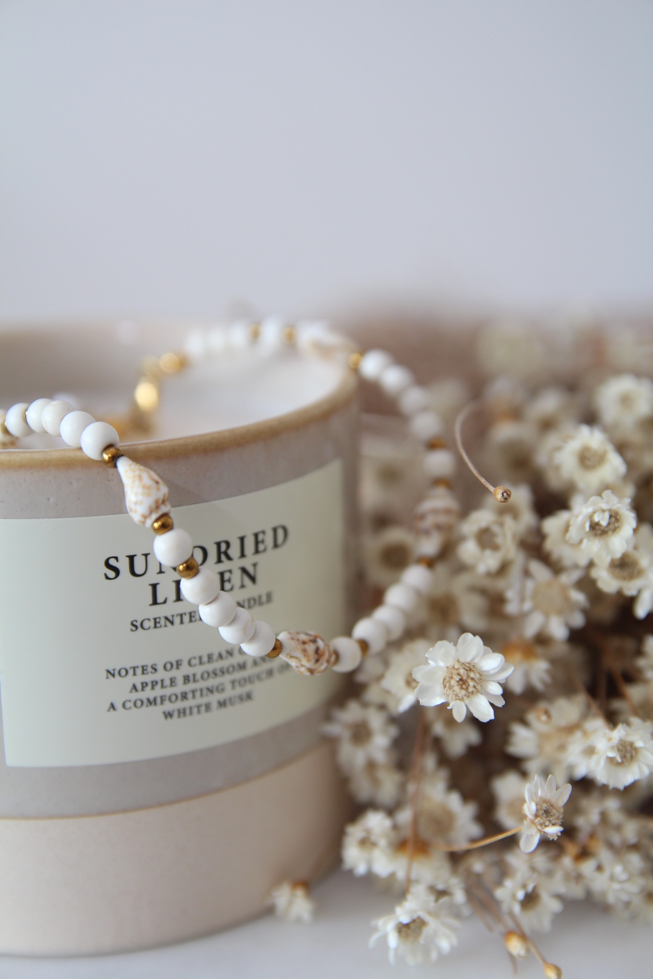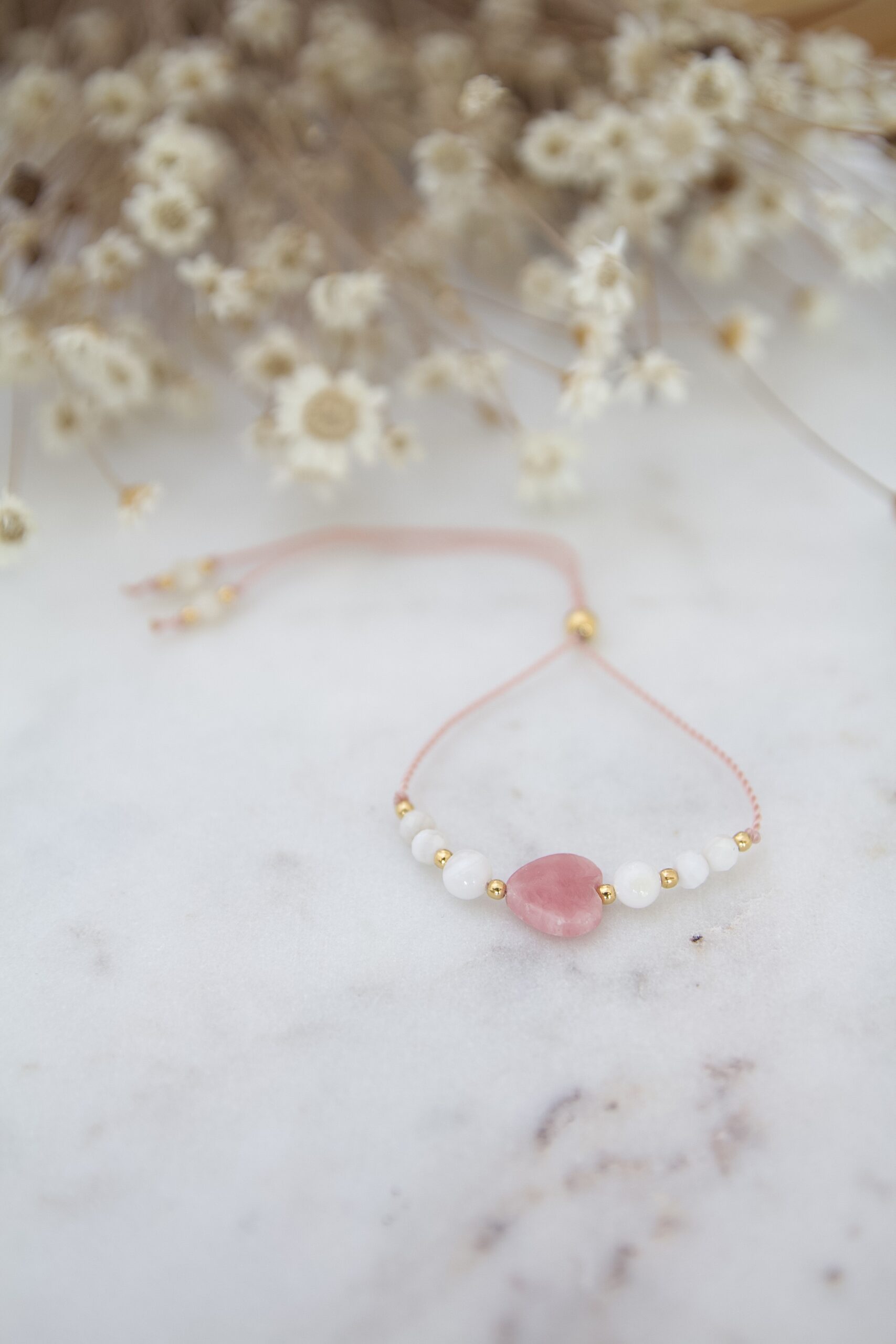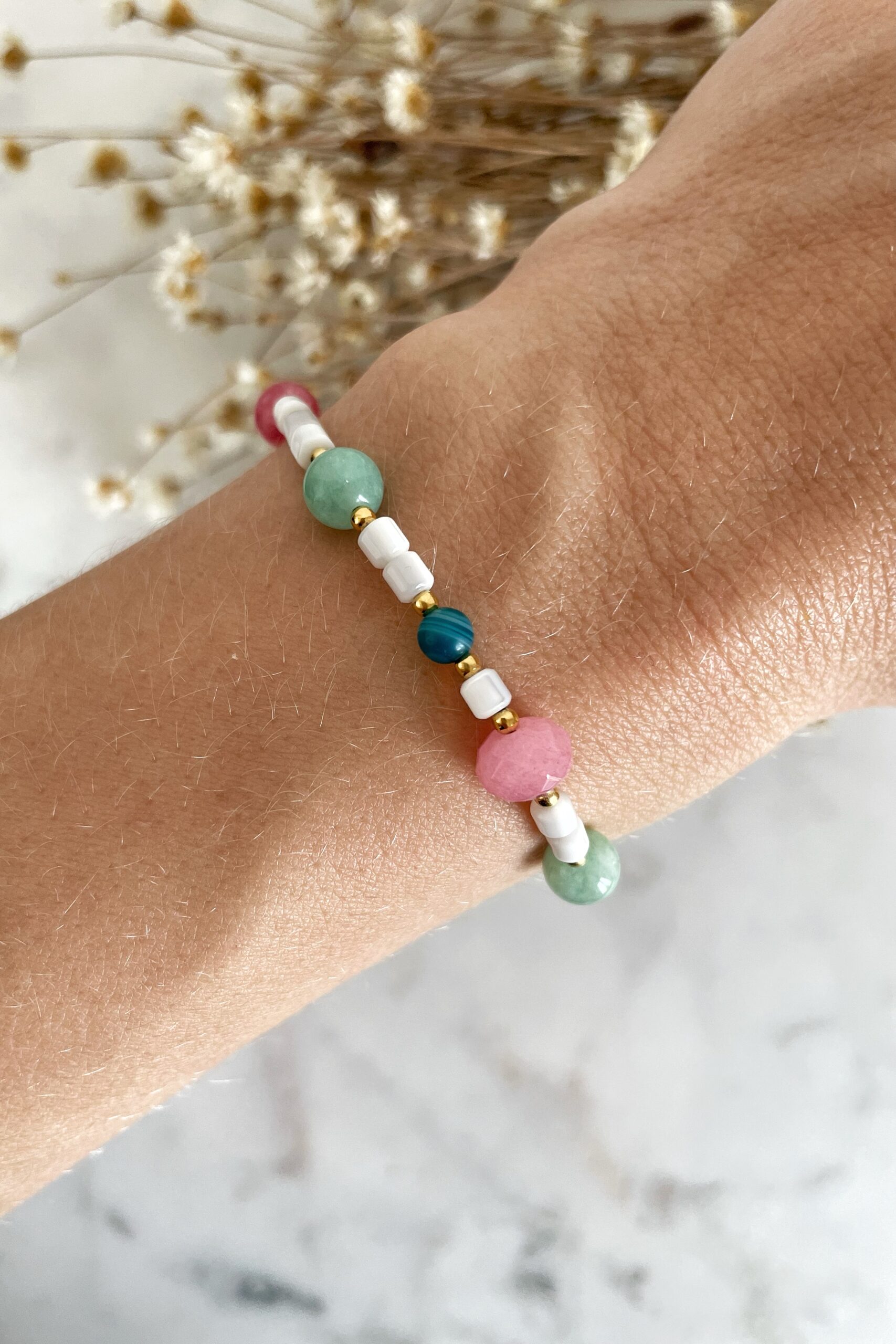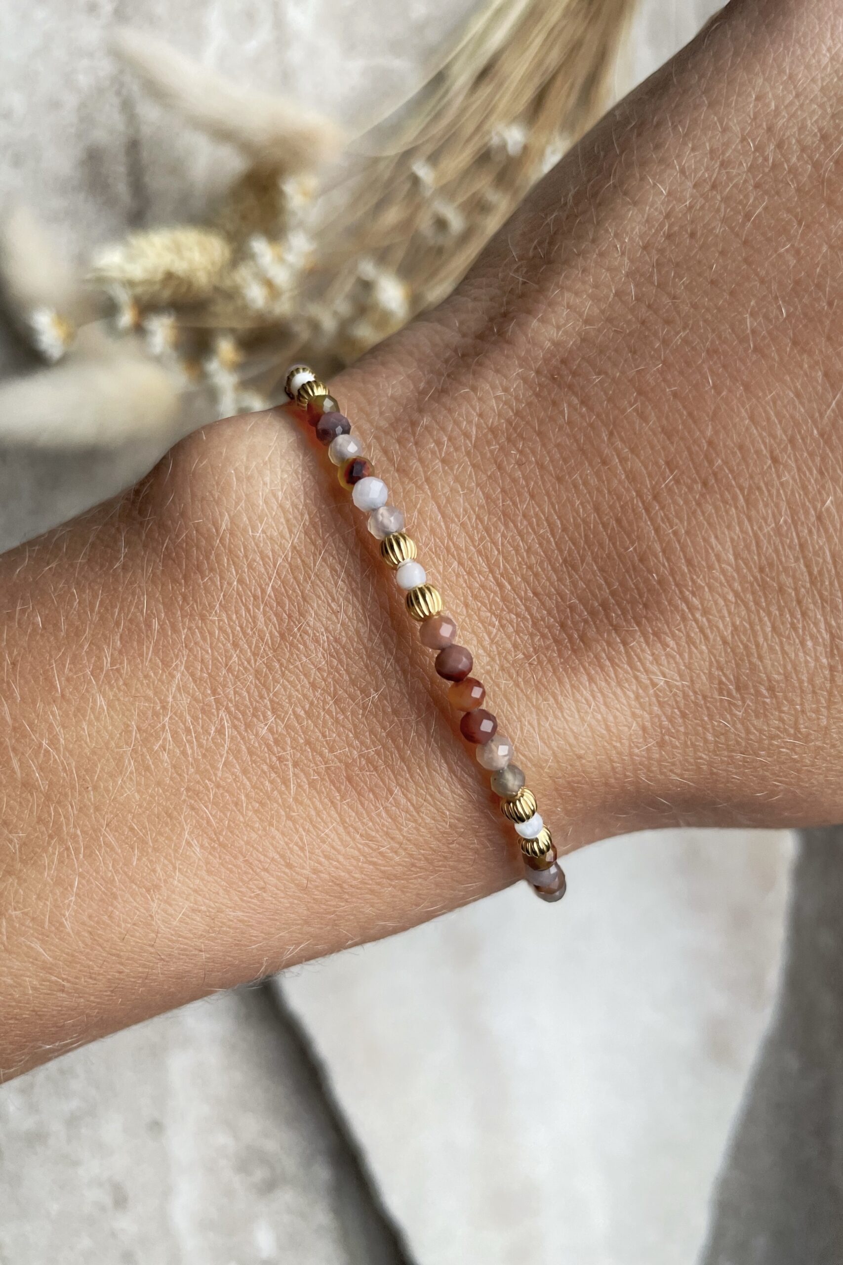 Scarlet jest w całości ze stosunkowo rzadkiego minerału o nazwie cynober. To kamień z przeważającym kolorem czerwieni oblanej odcieniami bieli i szarości. Te drobne, 3 mm koraliki naplecione na sznureczek będą stanowiły delikatną ozdobę dłoni.