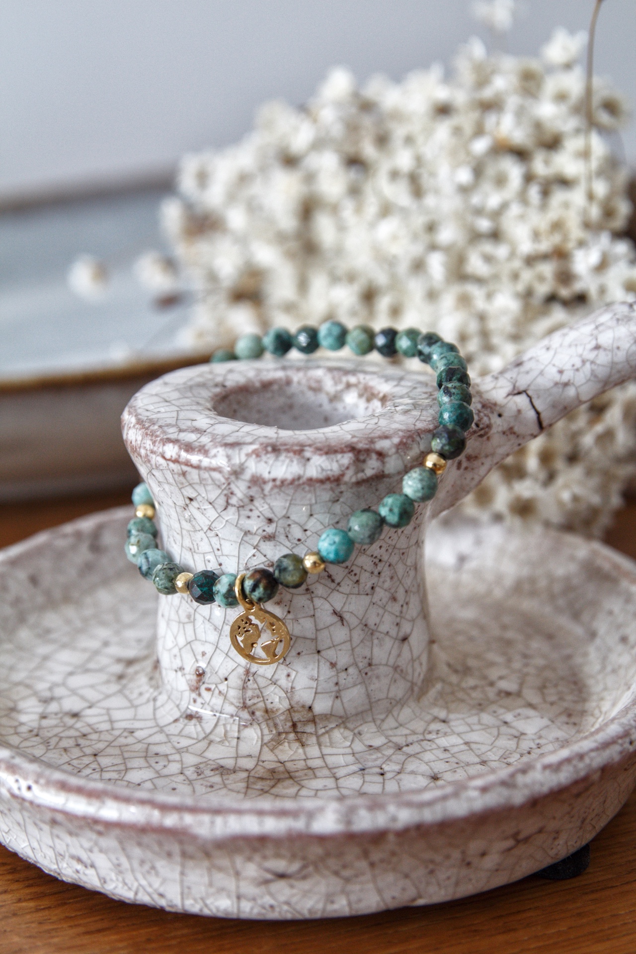 129,00 złMiss you world zrobiona jest w całości z turkusu afrykańskiego. Posiada zawieszkę w kształcie kuli ziemskiej.