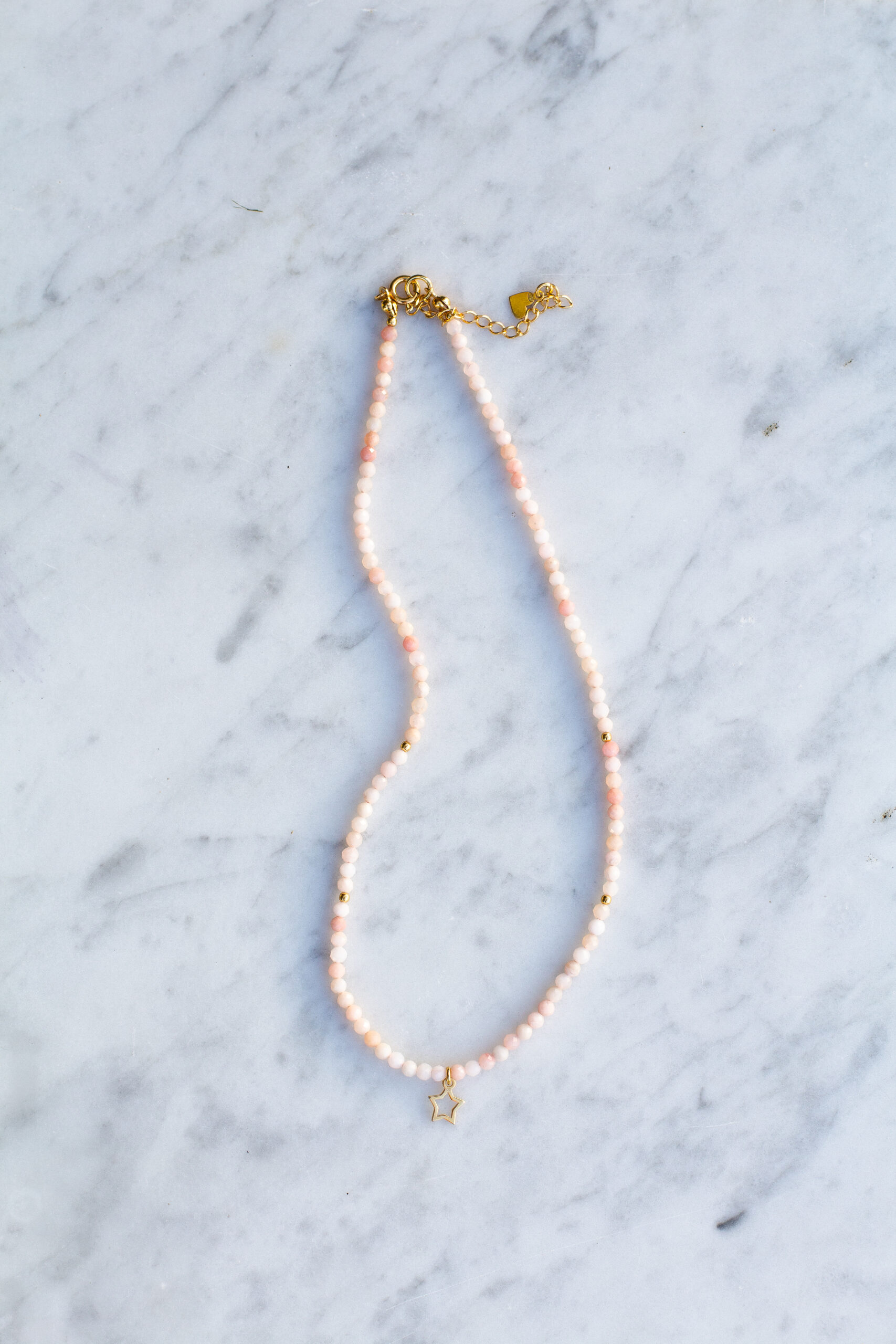 189,00 złNaszyjnik Astro to drobny, jasnoróżowy opal w formie fasetowanych kuleczek (3 mm) z delikatną zawieszką gwiazdką.