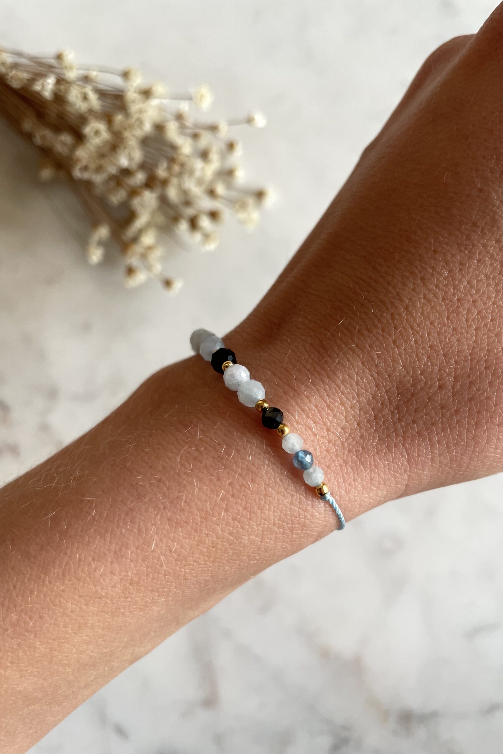 -22% Wyłącz 89,00 złPierwotna cena wynosiła: 89,00 zł.69,00 złAktualna cena wynosi: 69,00 zł.Ta bransoletka stworzona została z akwamarynu w dwóch rozmiarach (większe pośrodku, mniejsze z boku) oraz czarnego turmalinu. Wykonana jest na błękitnym sznureczku. To bransoletka „kawałek”, co oznacza, że kamienie są po części jej obwodu.