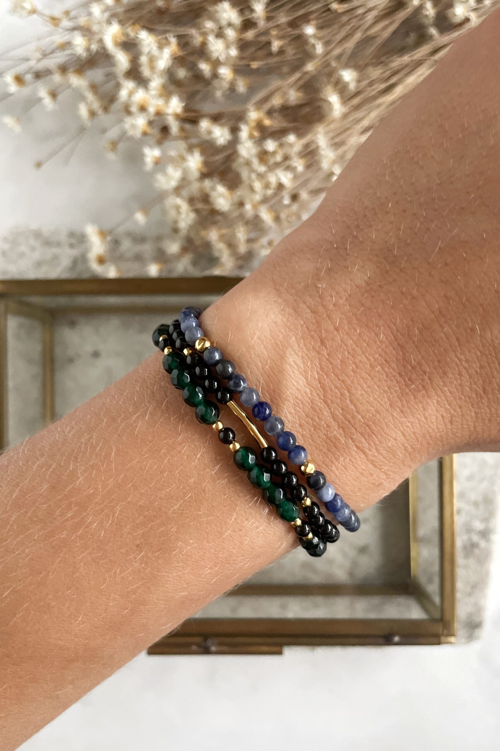 Varenna to bransoletka z gładkich kamieni sodalitu (3,5 mm) z dodatkiem „gniecionych” kuleczek srebrnych próby 925 pozłacanych 24k złotem. Niebieska barwa, nieco poprzecinana białymi żyłkami kalcytu przypomina niebo pokryte delikatnie nićmi chmur.
