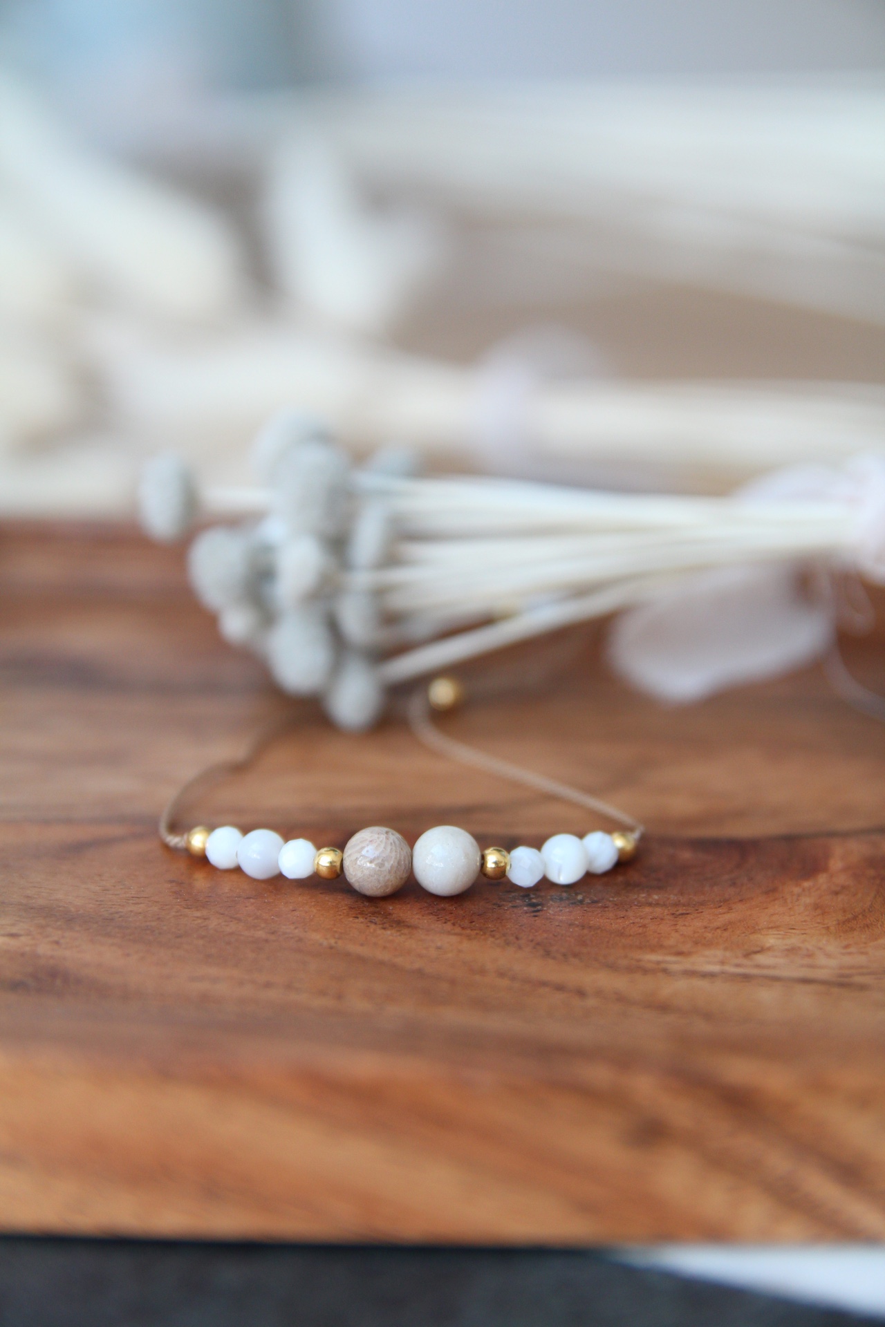 Agat trawiasty, z którego powstała ta bransoletka, to jasna, przezroczysta odmiana agatu w odcieniach zgaszonej żółci. Całość nawleczona jest na żółty sznureczek.
