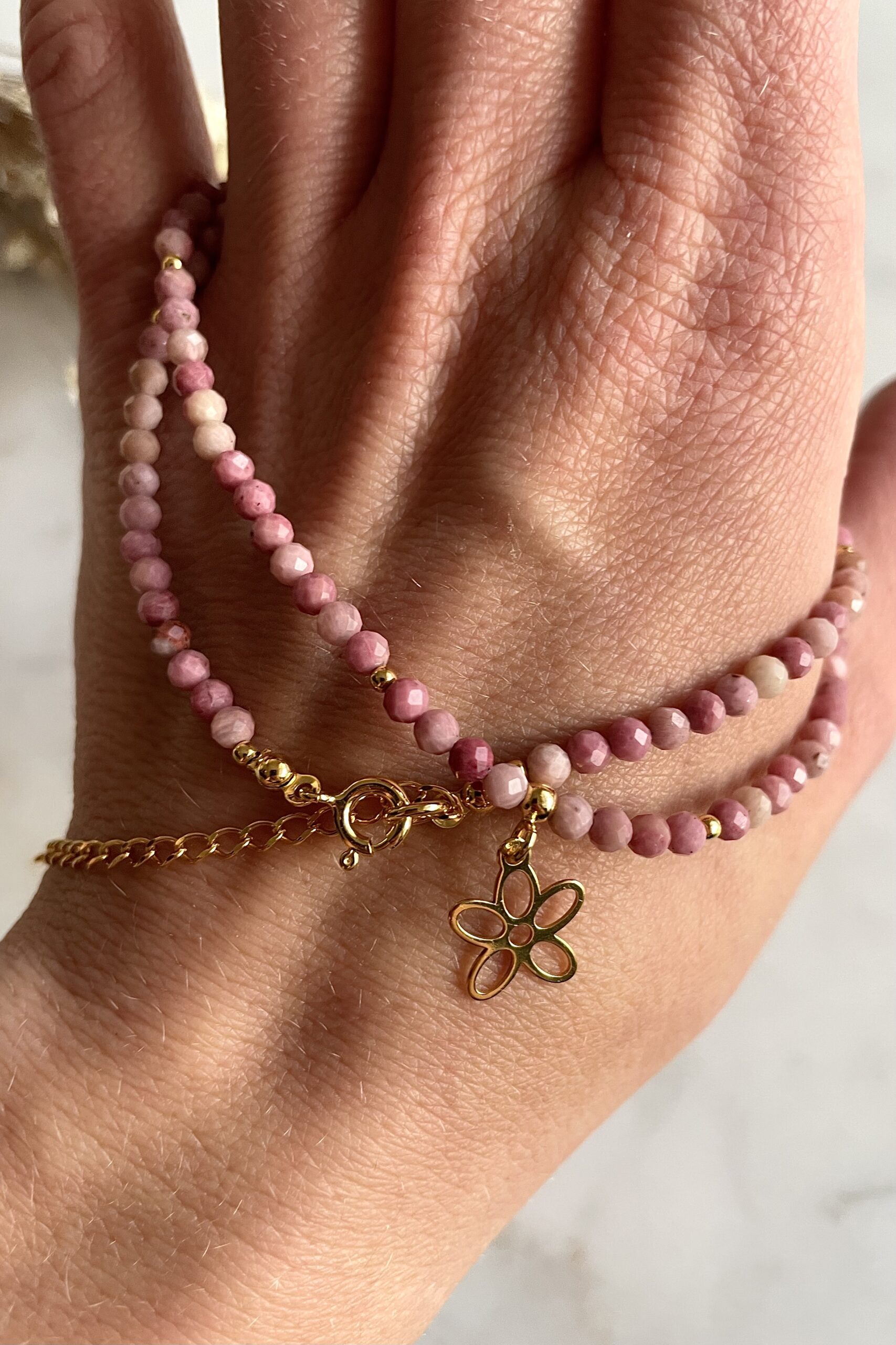 Ta bransoletka to połączenie rodonitu, rodochrozytu i kulek z muszli w pastelowym, różowym kolorze.