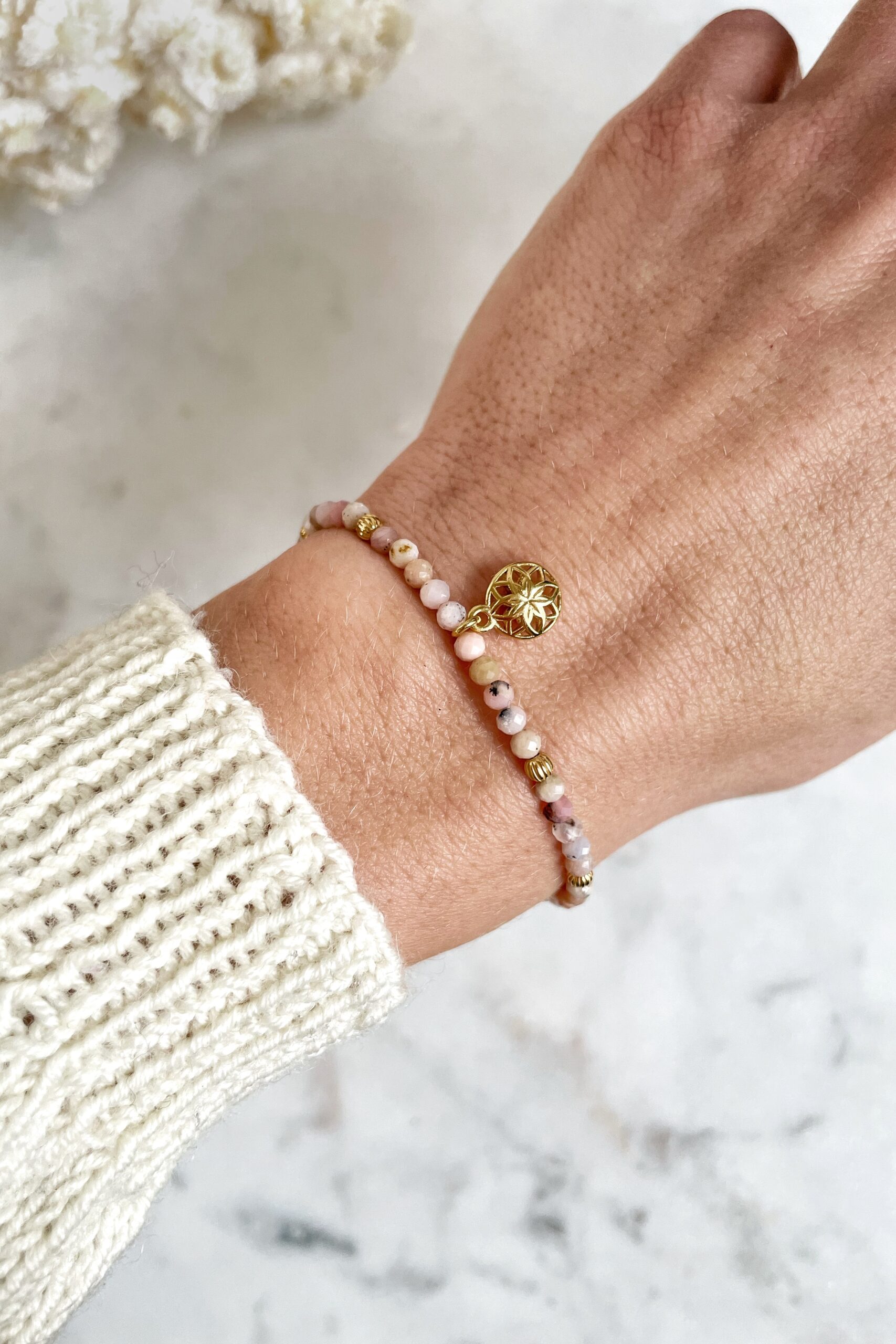Bransoletka posiada stoper – zapięcie z sylikonem, umożliwiające dopasowanie jej obwodu do dowolnego rozmiaru nadgarstka (od około 13-14 cm do ok. 22 cm). Sznureczek użyty do wykonania bransoletki jest nylonowy.
