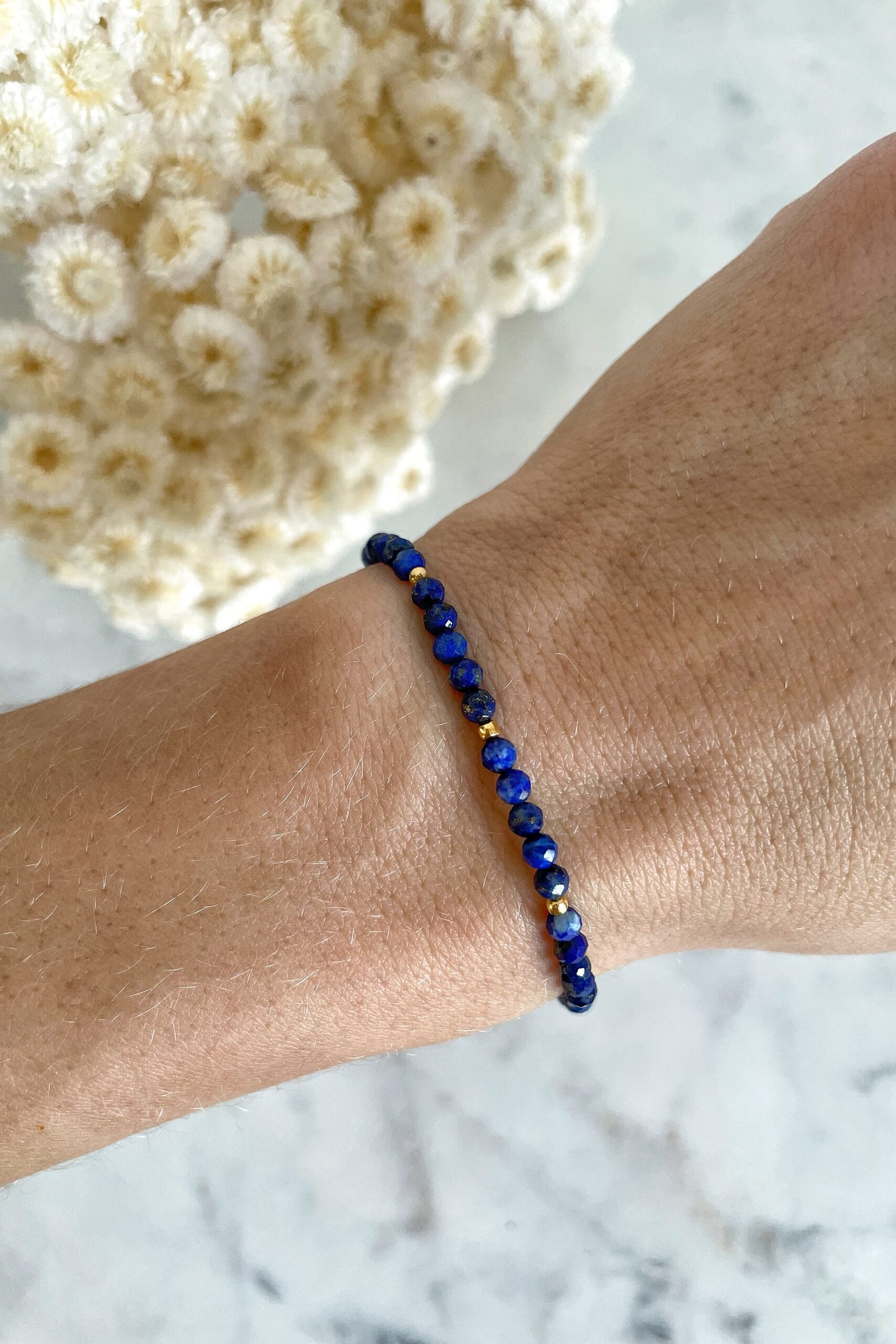 Bransoletka Porto powstała z kamienia lapis lazuli (3,5 mm) – przepięknego kamienia, mieniącego się kolorami granatu i niebieskiego. Ma głęboką, bardzo nasycona barwę.